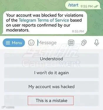 2、在Spam Info Bot频道中点击“START”,然后选择“This is a mistake”。