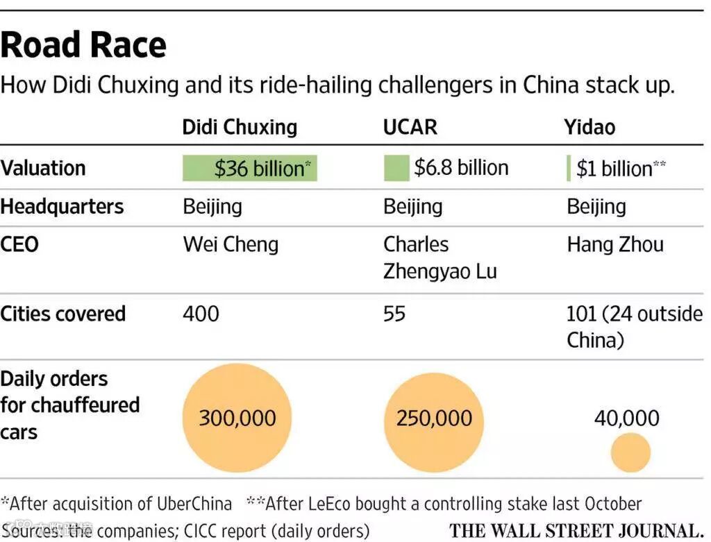 截至2016年8月,中国网约车的竞争对手(来源:华尔街日报)