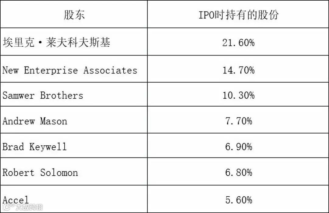 在IPO时,莱夫科夫斯基持有了公司21.6%的股份,是第二大投资者New Enterprise Associates的1.5倍,是联合创始人兼首席执行官安德鲁·梅森(Andrew Mason)的2.8倍。
