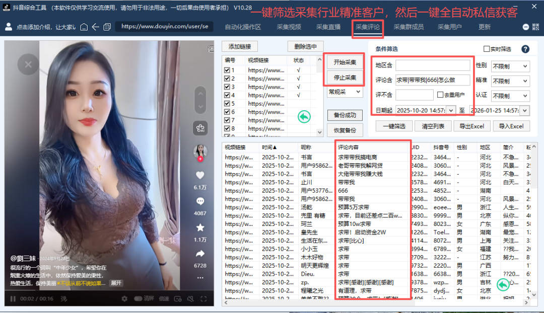 功能点六:视频评论采集(选择视频链接采集评论,支持条件筛选,可批量发私信,关注)
