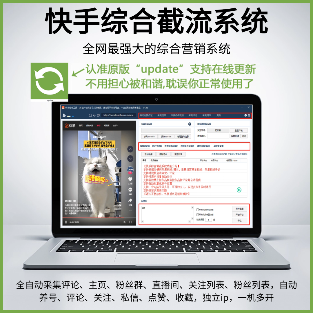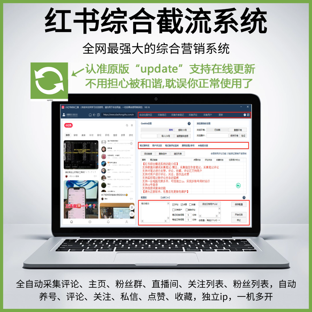全自动采集评论、视频、用户列表、采集作者笔记、视频新评论监控点赞最新评论、ai智能文案改写、一键全自动评论、一键全自动关注、一键全自动回复评论,点赞、独立IP 、一机多开、一键养号,持续自动更新。