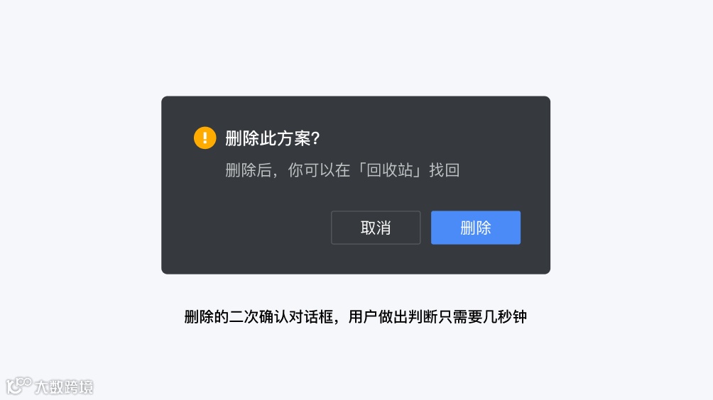 产品界面上的文案(UX 文案)与营销场景的文案很不一样,它带有很强的短期功能性,目的是帮助用户或产品后的企业达成短期目标,每段文案起作用的时间短则几秒,长不过几分钟。例如这个确认对话框,用户做出判断只需要几秒钟,之后它就消失了,可能很久都不再出现,几乎不会给用户留下印象。