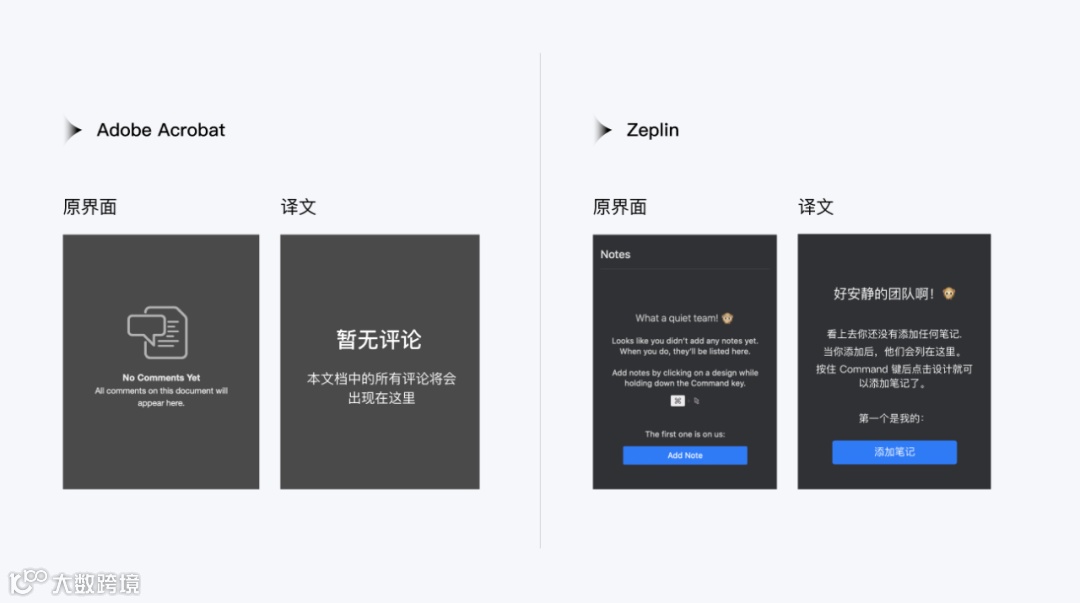 下图中,在类似情境(评论留言区为空时)下,Adobe Acrobat 和 Zeplin 的文案表现出截然不同的人物性格:Adobe Acrobat 冷静干练,Zeplin 则活泼幽默。