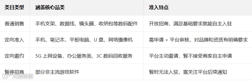 抖音把 3C 数码类目按准入难度分为普通销售、定向准入、定向邀约、暂停招商四类,不同类目门槛差异极大,先对号入座再准备材料更高效。