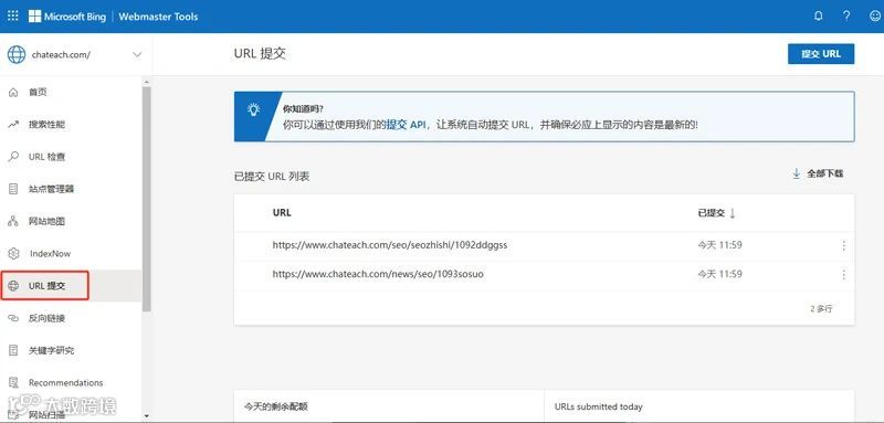 要激活“URL提交”入口,需要先进行一次手动提交。访问以下地址:<https://www.bing.com/webmasters/submiturl?siteUrl=>,并将其中的“主域名”替换为您绑定的网站域名,例如:<https://www.bing.com/webmasters/submiturl?siteUrl=https://chateach.com/>。通过这个链接,可以直接进入提交页面并完成URL的提交。