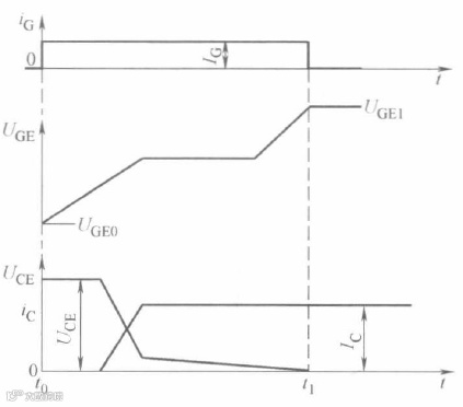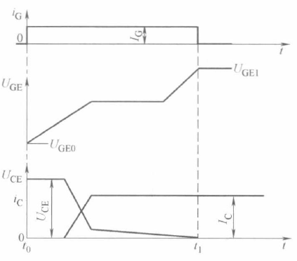 在栅极施加恒定电流IG至栅极-发射极VGE达到规定值时,监控初始时刻t0到栅极-发射极电压VGE达到设定的驱动电压时刻t1时的集电极-发射极电压VCE和栅极-发射极电压VGE,从而得到如下曲线: