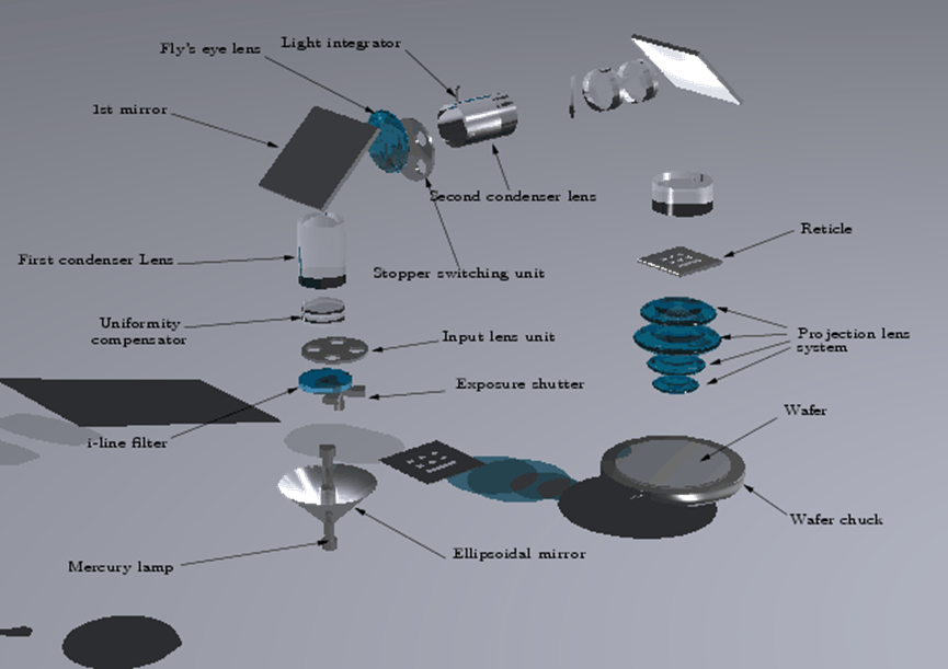 光刻是把“版图数据”转成晶圆上真实几何结构的关键步骤。常见做法是先把某一层的分层设计图写入光刻母版(也称掩膜/reticle):在石英基板上镀一层铬,再用电子束曝光把需要透明/不透明的图形刻出来。生产时,步进式或扫描式曝光机(stepper/scanner)用深紫外/极紫外光(i-line、DUV、EUV 等)把掩膜上的图形按比例投影到涂有光刻胶(photoresist)的晶圆上。一次只曝光晶圆上的一个小区域(称为“场”),然后反复“步进+曝光”,直到整片晶圆覆盖完成。每一个工艺层都有自己独立的掩膜,因此一款芯片往往需要几十张甚至上百张掩膜。