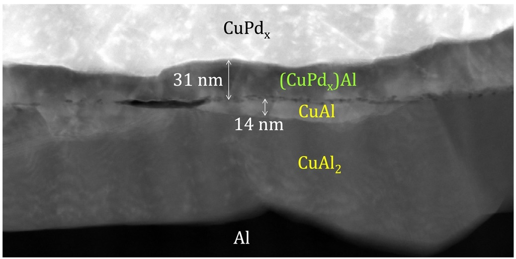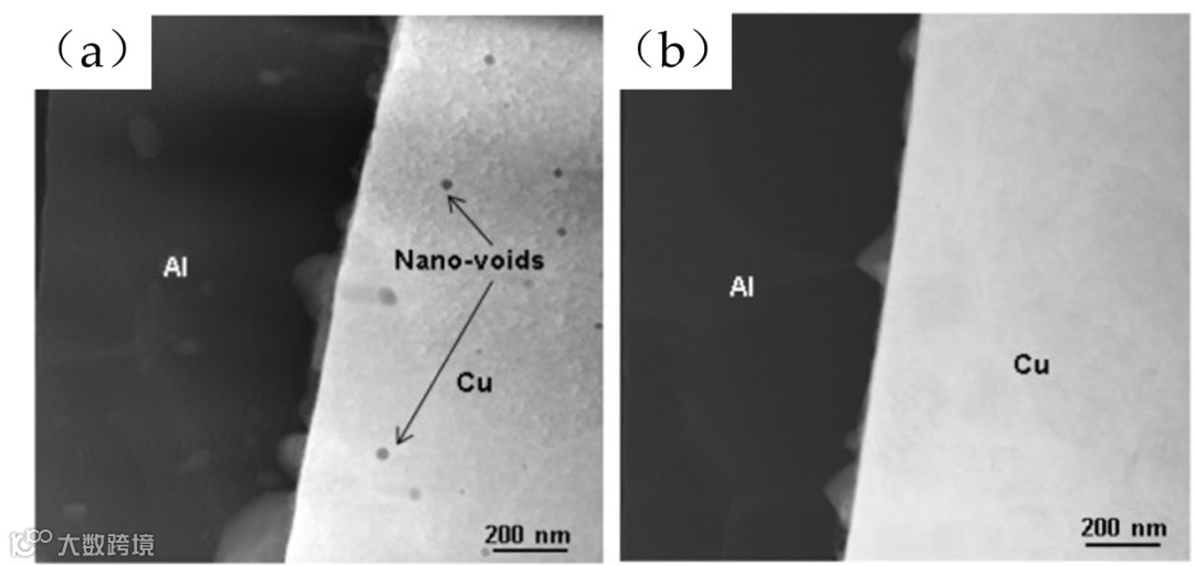 图1 高角环形暗场扫描透射电子显微镜(HAADF-STEM)图像:(a) 含钯的钯-铜键合,显示铜-铝金属间化合物层中存在纳米空洞(暗点);(b) 不含钯的钯-铜键合