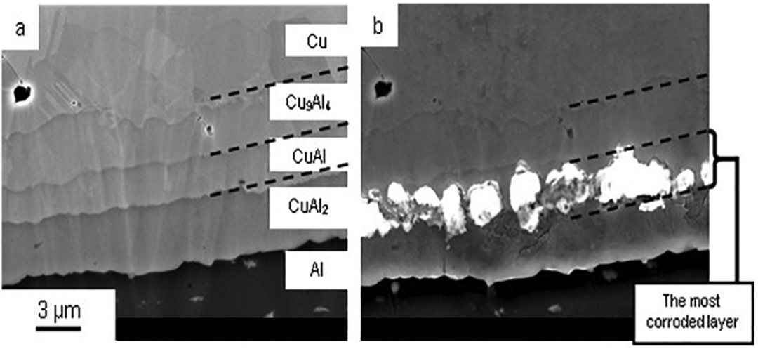 因此,使用低氯含量的模塑料、采用合适的金属涂层以及改进生产工艺,对于降低金属间化合物的腐蚀速率、提高键合可靠性至关重要。此外,学者们在减少和防止腐蚀方面进行了诸多尝试:Motoki Eto等人采用了一种新的键合后热处理技术,发现该工艺可有效抑制铜-铝金属间化合物的腐蚀进程;他还发现,铜-铝焊盘的腐蚀过程不仅受铜/铝金属间化合物与模塑料杂质之间化学反应的影响,还受腐蚀形态、各铜-铝金属间化合物产物以及晶格失配所引发的拉伸应力等机械因素的影响。