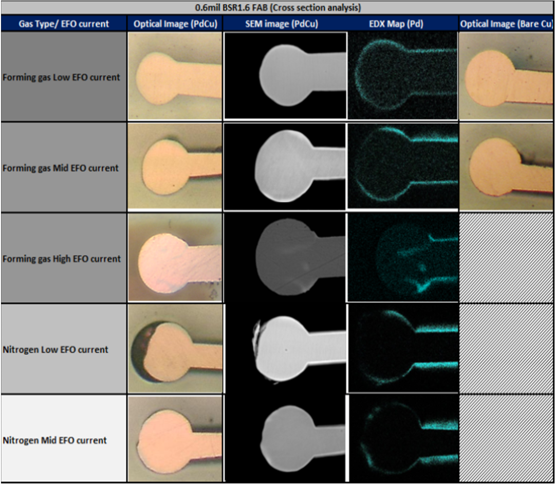 自由空气球(FAB)是金属键合过程中形成的自由球形结构,其对键合可靠性具有显著影响,其中最突出的是对键合强度的影响。均匀稳定的自由空气球有助于形成牢固的焊点,从而提高键合可靠性。Hong Meng Ho等人对铜丝的成球特性进行了研究,发现较大的电子火焰熄灭(EFO)电流或较短的成球时间有助于更好地控制自由空气球直径的标准差;该研究还揭示了铜焊球硬度与电子火焰熄灭(EFO)参数之间的相关性,表明较高的电子火焰熄灭(EFO)电流会使自由空气球更软。对于铜丝键合,为获得更软的自由空气球并最小化初始键合冲击时的应力,建议在较短的通电时间内形成自由空气球。A.B.Y. Lim等人比较了PCC丝和裸铜丝的自由空气球形成及键合差异(见图3),发现在不同气体类型和电子火焰熄灭(EFO)电流条件下,PCC丝会形成不规则焊球;钯在自由空气球上的分布受保护气体类型和电子火焰熄灭(EFO)电流的影响,其中电子火焰熄灭(EFO)电流是主要影响因素,调整电子火焰熄灭(EFO)电流可获得不同的钯分布;研究还观察到PCC丝键合后界面存在间隙,这些间隙与钯的存在密切相关。将PCC丝键合样品在175℃下退火24小时和168小时后,观察到两层金属间化合物。该实验结果对于理解钯分布导致的键合界面间隙形成机制以及自由空气球对键合可靠性的影响具有重要意义。