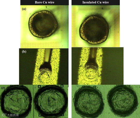 作为金线的替代方案之一,裸铜丝已被广泛研究用于铜键合应用。然而,裸铜丝面临硬度高、易氧化和键合失效等挑战。由于缺乏绝缘层,裸铜丝可能不适用于某些封装场景,需要额外的绝缘措施,这极大地限制了其发展。Tomohiro Uno等人在比较裸铜丝和镀钯铜(PCC)丝的可靠性时发现,裸铜丝的失效时间短于PCC丝,表明裸铜丝的键合可靠性不如PCC丝,且裸铜丝的键合界面存在严重腐蚀。