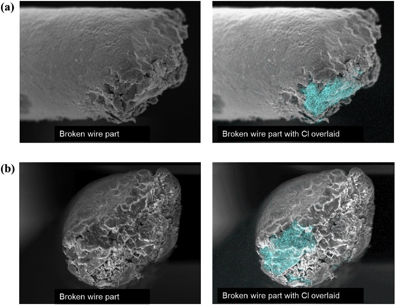 图8 含氯分布的断裂第二键合点铜丝的扫描电子显微镜(SEM)/能量色散X射线光谱(EDX)mapping图像:(a) 侧面图;(b) 正面图