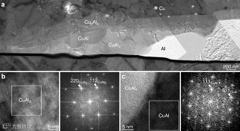 图5 (a) 铜键合丝与铝焊盘在175℃下老化2000小时后,铝层完全消耗的界面明场透射电子显微镜(BF-TEM)图像;(b) CuAl₂和(c) CuAl晶粒的高分辨透射电子显微镜(HRTEM)图像,以及(b)和(c)中白色方框区域的快速傅里叶变换(FFT)图像