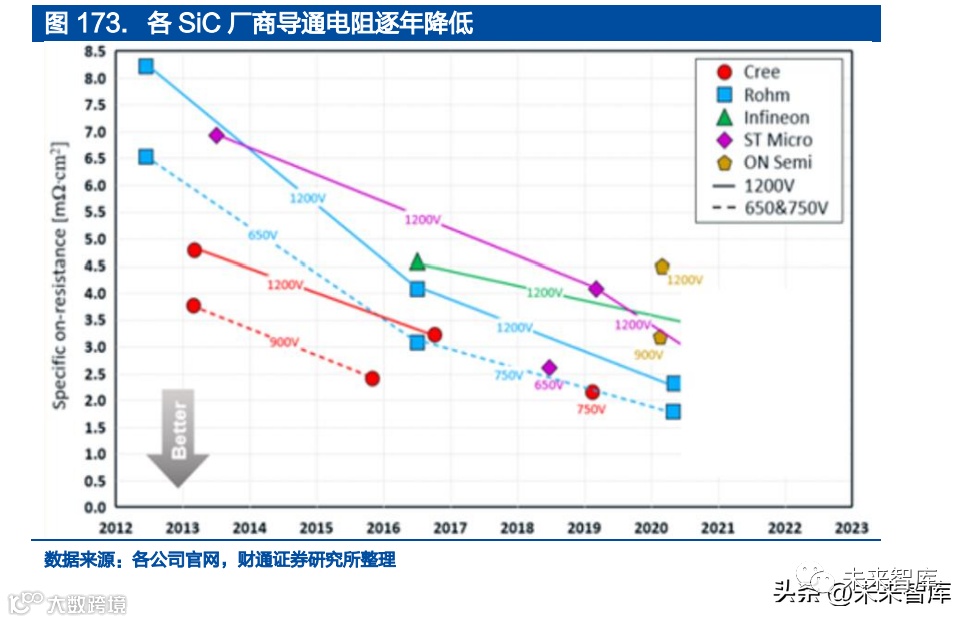 正迎国产替代黄金期。在输出相同电流的前提之下,比导通电阻越低,需要的器 件数越少,器件的芯片面积可以越小,成本也越低。在 1200V 领域,ROHM 做 到 2.3 毫欧,Wolfspee(Cree)做到 2.7-2.8 毫欧之间,英飞凌、ST、安森美做 到 3-3.5 毫欧之间,而国产接近 4.5-5 毫欧。意味着输出相同的电流,国产器 件的面积是 Wolfspee(Cree)和 ROHM 两倍左右,造成了海外器件的成本优势。但随着国内加大研发投入,提升良率及技术水平,凭借我国在新能源汽车、光伏 等 SiC 应用的主要市场的一定先发优势,恰逢缺芯以及国产替代黄金期,产品验 证壁垒及周期相对较低,使得我国 SiC 器件加速发展。