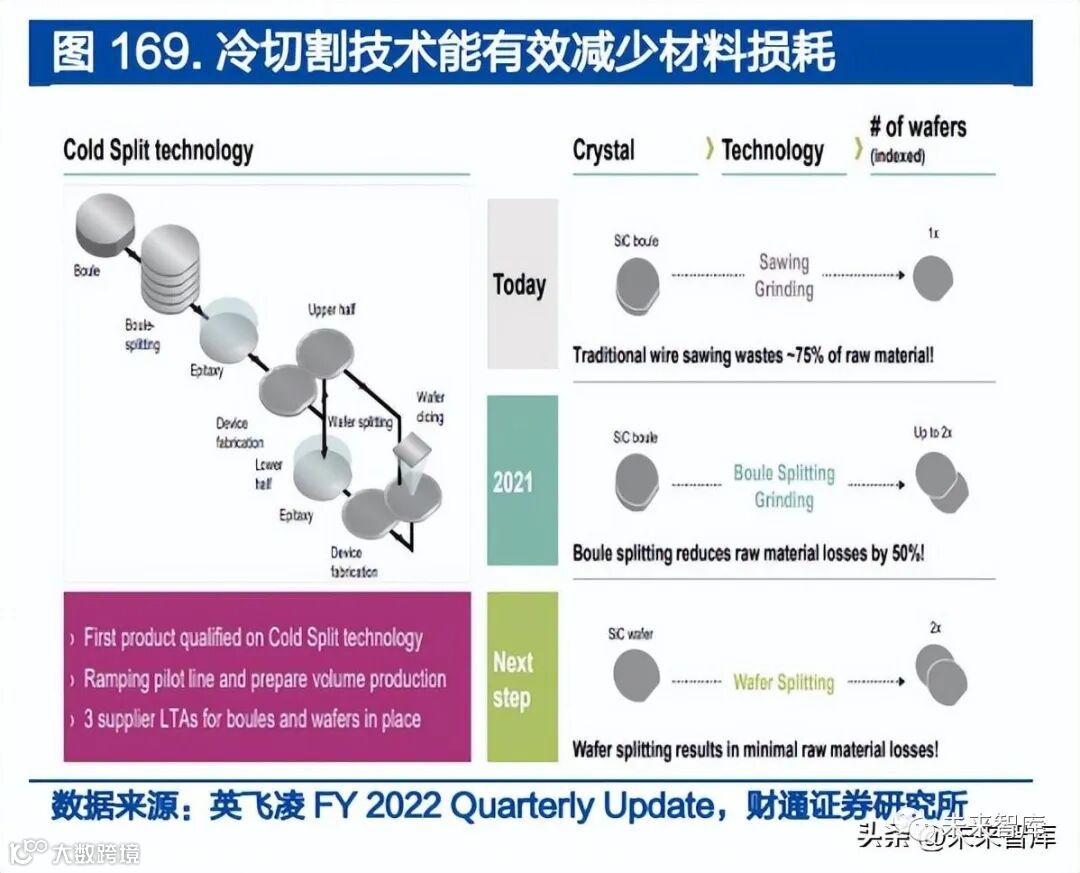 英飞凌冷切割技术推动晶圆的产能得到大幅提升和更高效的应用。英飞凌在 2018 年 11 月收购 Siltectra,该公司具备一项能够大幅减少材料损耗的切割晶 体材料技术(Cold Spilt),能与 SiC 一起应用,英飞凌计划在未来五年内实现该 技术的工业化规模使用,从而使得单片 SiC 晶圆产出芯片数量在 2022 年增加 2 倍,从而有效降低 SiC 成本。
