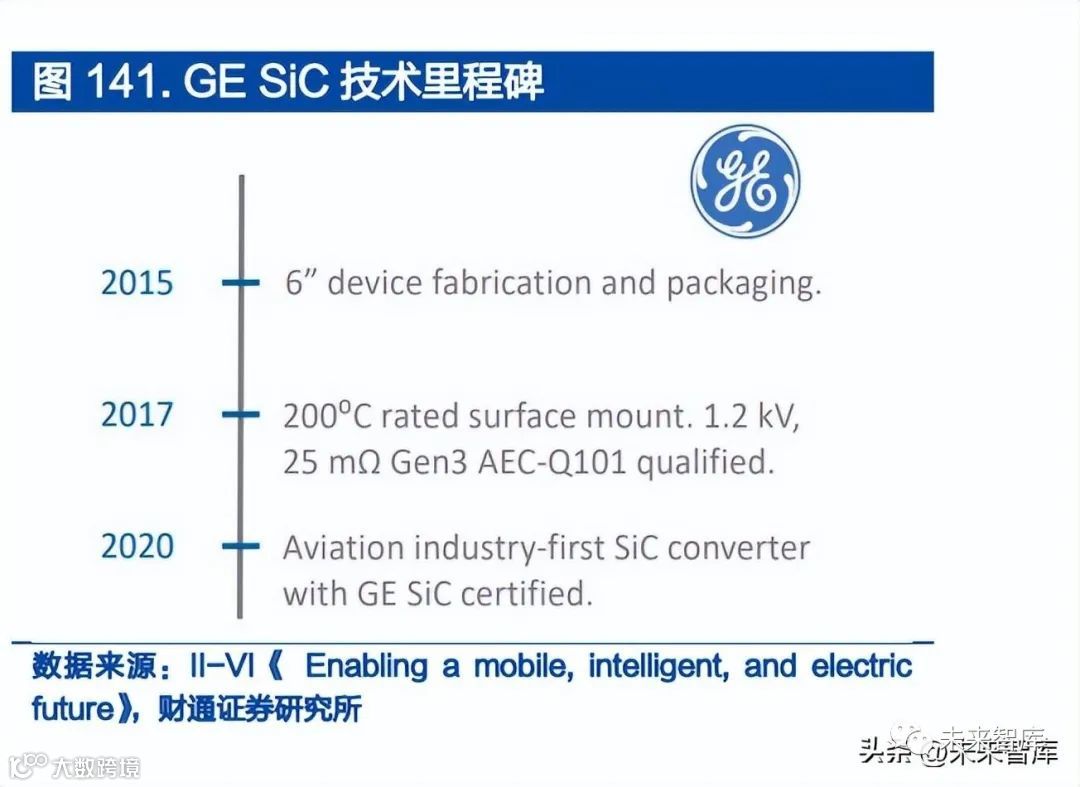 通过垂直整合构造 SiC 产业链。II-VI 在具备 SiC 衬底技术的基础上,2020 年 与 GE(通用电气)签署了大规模的专利许可协议,共享仅在 GE 内部使用的专 利技术,共同开发 SiC 器件和模块,并通过 II-VI 进行量产,将其应用于飞机以 外的各个行业,例如汽车和医疗保健。目标是提供可应用于车载充电器(OBC)和 安装在电动汽车内的电机的 SiC 器件和模块。2022 年 2 月,II-VI 公司宣布其在自有高质量 SiC 衬底上制作的 1200V SiC MOSFET 已达到严格的汽车标准要求,并通过与 GE(通用电气)研究院签署 为期三年的技术准入协议(TAA),以获得该实验室的世界级 SiC 模块技术和专 家团队,加速客户设计参与活动。目前,公司主要产品为 1200V 和 1700V 级 SiC。II-VI 还计划在未来与 GE 一 起开发 2500V 的下一代 SiC 半导体。2020 年 8 月 II-VI 又收购了 Ascatron (生产 SiC 外延片和器件)和 Innovion(世界级大型离子注入服务提供商),向 下游器件延伸,补充技术平台。