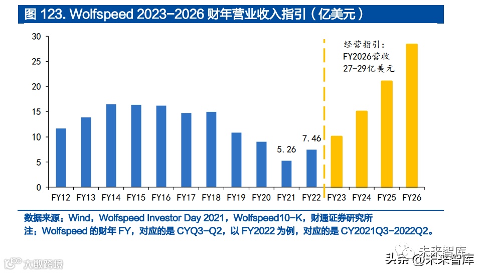 业务需求增加,营收持续增长。新冠疫情、供应链扰动、高通胀环境之下, Wolfspeed 维持快速增长。FY2021 实现营业收入 5.26 亿美元,同比+12%;FY2022 公司实现营收 7.46 亿美元,同比增长 42.0%,其中 FY22Q4 实现营 收 2.29 亿美元,同比+57%/环比+22%,超过此前的指引上限 2.15 亿美元。SiC 材料及器件下游需求旺盛,根据公司投资者关系介绍,预计 FY2023 营收 约 10 亿美元,考虑功率设备需求增加,将 FY2026 的收入预测较此前的 21 亿 美元上调 30%-40%至 27.3-29.4 亿美元,FY2022-26 期间 CAGR 约 40%, 长期增长趋势强劲。