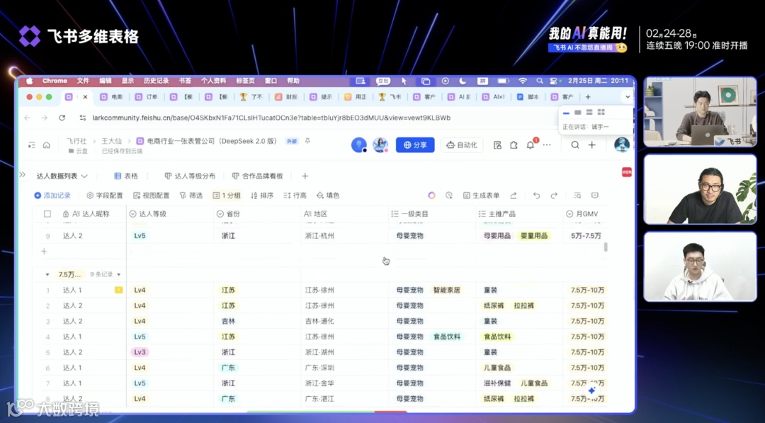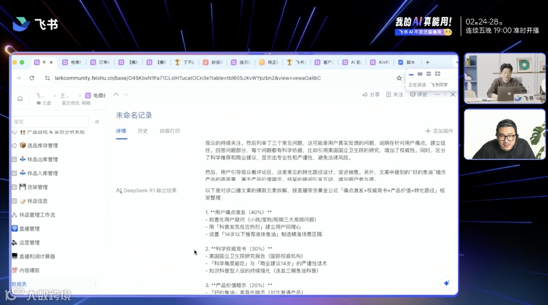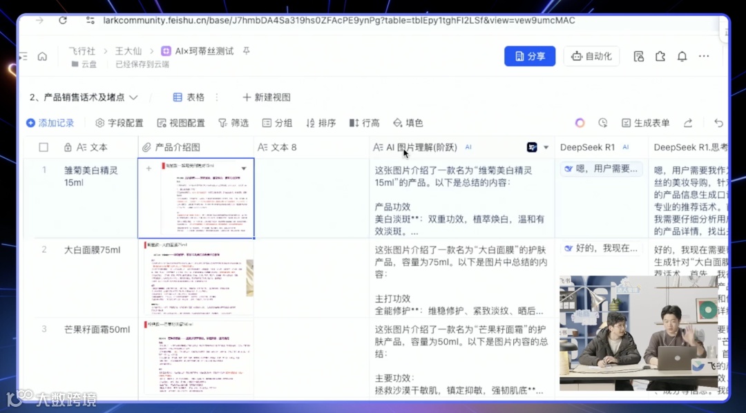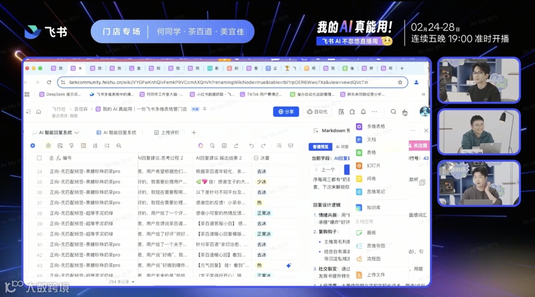 在这几天的直播里,我们正在看到:不论是电商卖货还是门店管理,一线从业者们对实际业务场景中AI应用的探讨,比预想得更快、更超前。经过几天教学直播,不禁要说,飞书多维表格可能是目前为止,最好上手的 AI工具 。
