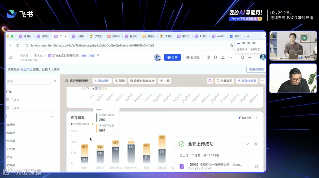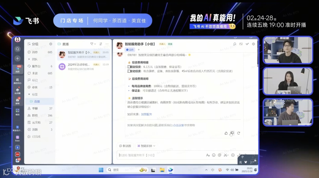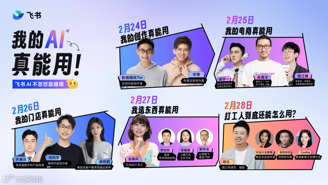 2月24日,飞书开启了为期五天的“我的AI 真能用——飞书 AI 不忽悠直播周”活动,邀请来自亚朵星球、美宜佳、茶百道等来自电商、零售、制造行业的一线员工分享AI在业务中的应用。此外,还有影视飓风Tim、毕导、何同学、呼兰、赵晓卉等知名UP主、艺人一起参与。