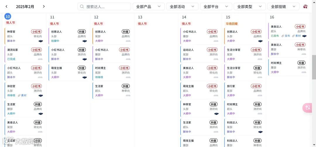在脚本沟通环节,团队可以实时查看达人的工作状态,一旦出现可能延期的情况,系统会自动发出预警,确保整体投放节奏的顺利进行。投放结束后,互动数据会自动汇总,并生成分析报告,为后续的复盘和策略优化提供有力的数据支持。