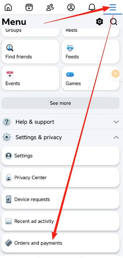 在菜单中,你可以看到包括“主页”、“群组”、“好友”等多个选项。继续向下滑动,直到看到 “Orders and Payments”(订单和支付)选项,这一部分就是与Meta Pay相关的设置区域。点击它进入。