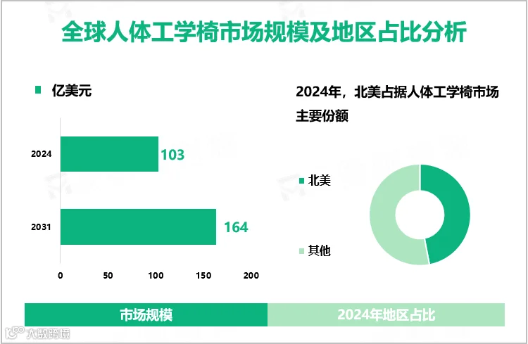 贝思哲的数据显示,全球人体工学椅的市场在2024年达到了103亿美元,从全球来看,近一半是掏自美国人民的腰包,并且预计到2031年将突破160亿美元的规模。