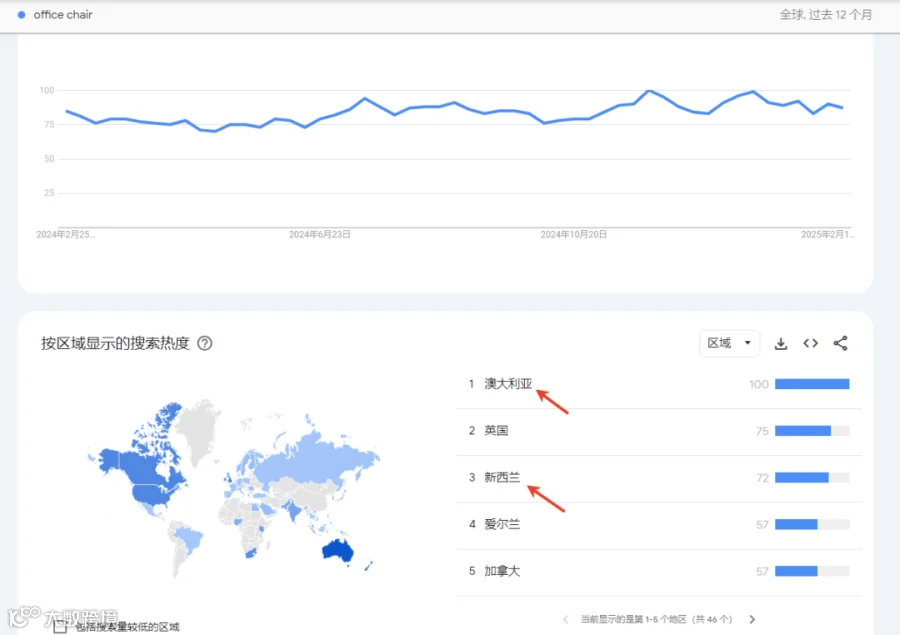 其中,澳大利亚和新西兰等亚太地区的国家对办公椅有更强的搜索量,搜索热度均冲进了前三的位置。