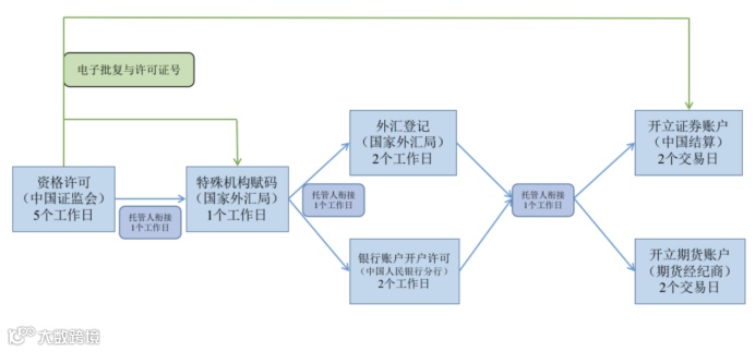 合格境外投资者资格许可法定时限为10个工作日,承诺办理时限5个工作日;特殊机构赋码办理时限1个工作日;外汇登记办理时限2个工作日;银行账户开户许可办理时限2个工作日;证券期货账户开立时限2个交易日。托管人衔接办理时限如五(二)所列。办理时限自托管人完成尽职调查等工作后、各单位收到完整材料起算。办理流程示意图见附件2。