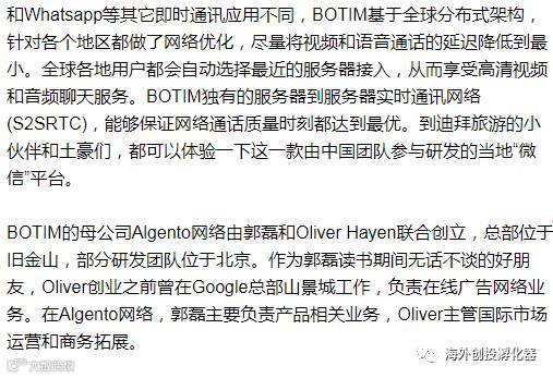 在哥伦比亚和巴拿马旅行时,郭磊发现在某几个运营商的4G网络上,Whatsapp发送图片非常缓慢,视频通话几乎不可行。而在沙特,大部分视频通话应用的通话图像在WIFI下都很卡顿。因此,他就想是不是可以针对当地做一个体验更好的即时通讯产品,把服务器架设到距离当地最快的数据中心,借助Algento网络独有的全球分布式实时通讯网络把中国和美国的优秀通讯体验带到当地去,让所有人都可以享用现代科技带来的便利。