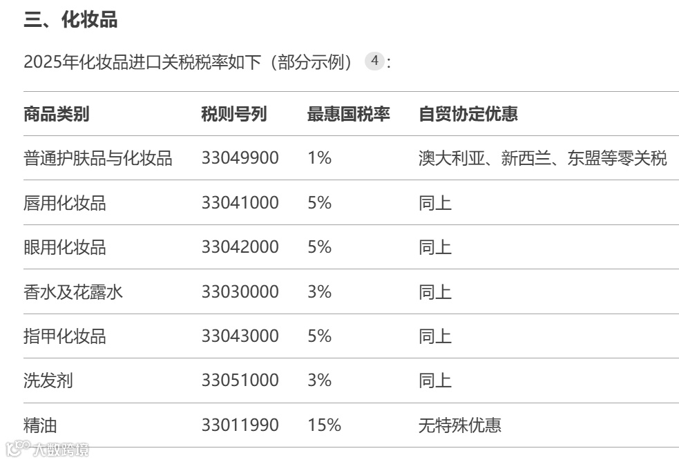 3. tariff 即关税,又称import duty,仅是duty的一部分。中国已与韩国、澳大利亚签署自贸协定,通过RCEP与日本实现大部分商品零关税。且中国本身多数商品关税较低,例如普通化妆品1%、香水3%、唇彩5%,因此零关税对终端价格影响有限[k]。