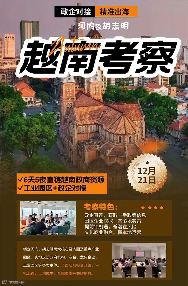 越南商务考察团,目前仅少量余位。我们将带领企业家们前往胡志明市与河内,深入越南的消费市场,直链越南政商资源,布局出海落地。