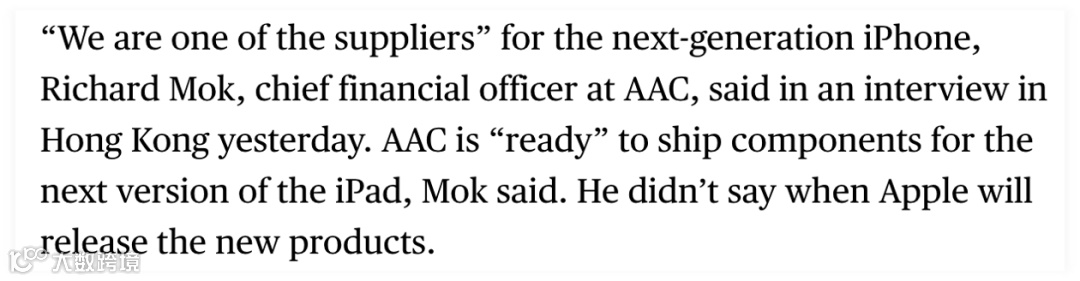 微型麦克风(MEMS ):据 2014 年报道,AAC 为 iPhone 5 及 iPhone 5s 提供 MEMS 麦克风,意味着至少从 2013‑2014 年就已进入 Apple 的麦克风供应链。