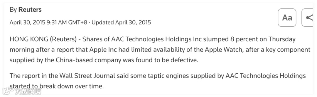 在2015年Apple Watch刚推出时,AAC 被指出其为 Apple 手表提供的 “Taptic Engine”(触觉反馈马达)部件出现了可靠性问题。具体来说: