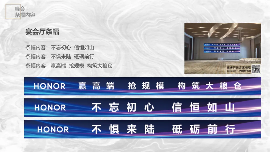 内场规划,舞台效果、桌面装饰、条幅内容,都得跟主题紧密结合。比如荣耀的条幅“不忘初心 信恒如山”,直接传达了品牌理念。
