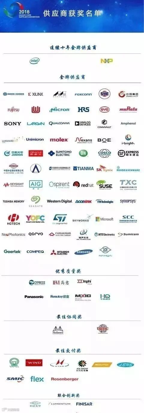 金牌供应商:灏讯、赛灵思、美满、富士康、生益电子、中利集团、富士通、沪士电子、美光、广濑、比亚迪、村田、索尼、大立光电、高通、亚德诺、康沃、安费诺、立讯精密、欣兴电子、莫仕、耐克森、京东方、阳天电子、中航光电、甲骨文、住友电工、安森美、中远海运集团、顺丰速递、中国外运、新能源科技有限公司、舜宇光学、天马、SK海力士、罗德与施瓦茨、是德科技、美国国际集团、思博伦、红帽、SUSE、晶技股份、东芝存储、希捷、西部数据、光迅科技、迅达科技、新思科技、华工科技、长飞、意法半导体、思佳迅、微软、深南电路、新飞通、Qorvo、古河电工、瑞声科技、联恩电子、Sumicem、歌尔股份、华通电脑、三菱电机、三星、南亚科技