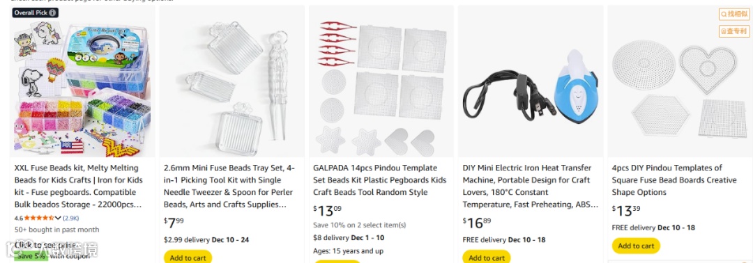 除基础材料外,亚马逊上还有各种拼豆工具套装,包含拼豆板、熨烫纸、豆铲等,满足不同层次用户的需求。