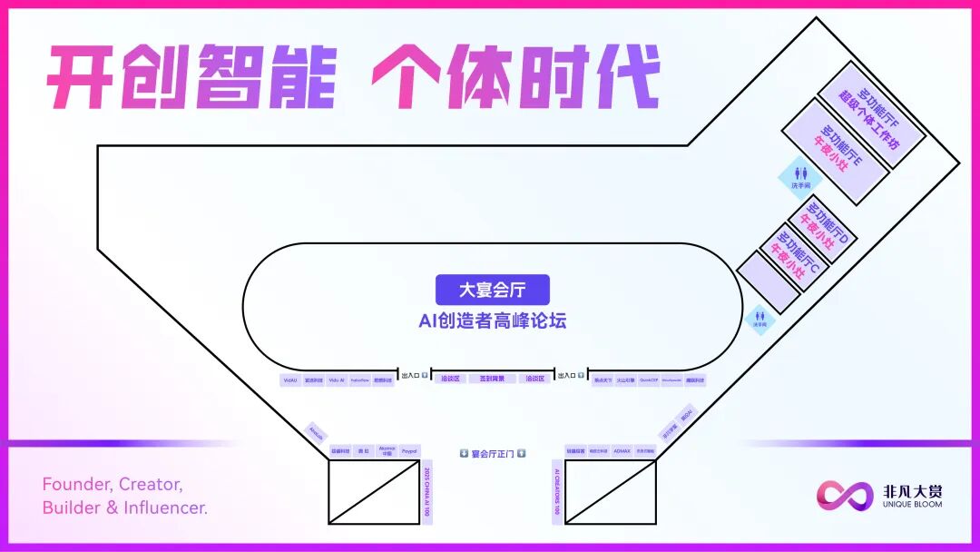 我们创造性的引入线下约聊环节,开辟出匹配速聊区域,与会者可在AI圈子中联系现场嘉宾,经双向匹配后,可以在现场与Founder/Creator/Builder/Influencer一对一交流。这一创新的尝试预计会大大增进参展方与潜在客户的交流意愿、沟通效率与深度,尽可能促进合作落地。