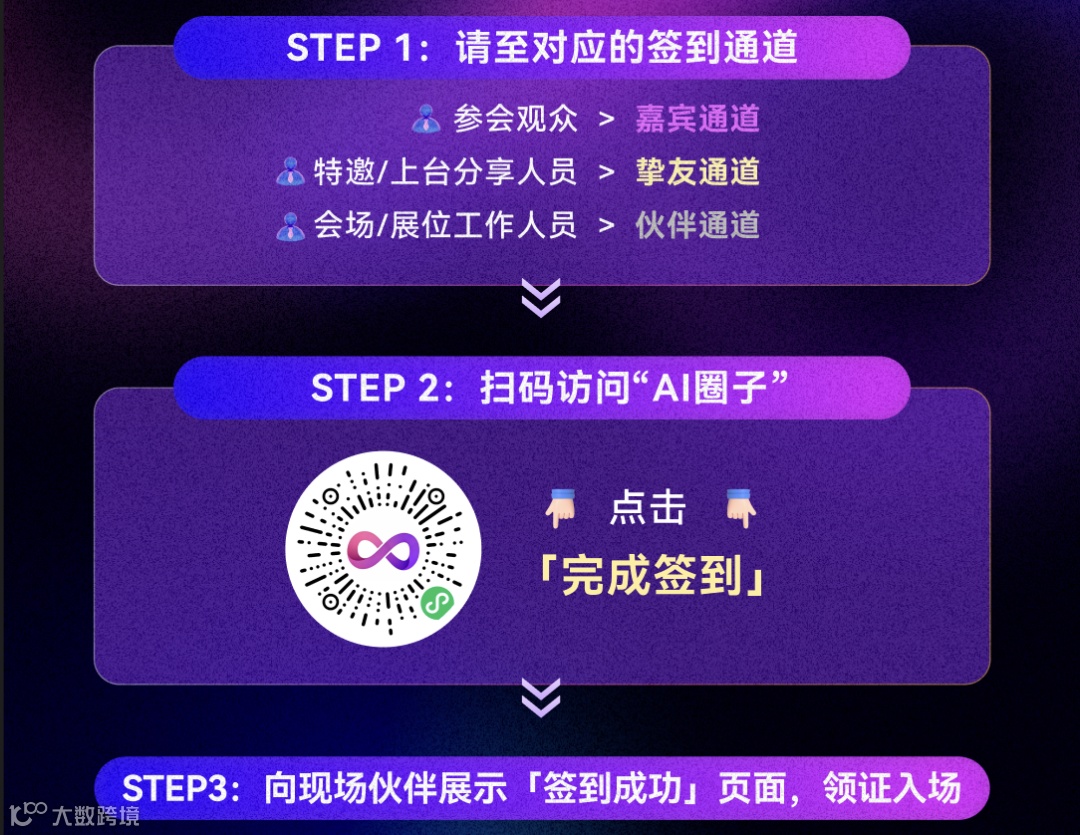 到达会场后请进入AI圈子进行现场签到,经工作人员核验并领取参会证后,即可进场。