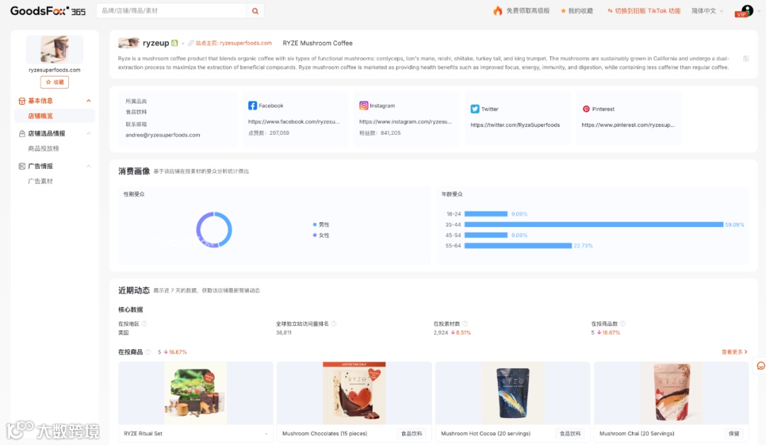 另一头部品牌 RYZE 凭借"有机咖啡+六种功能蘑菇"的科学配比异军突起,GoodsFox 数据显示该品牌周均投放素材近 3000 条,核心消费群体集中在35-44岁(占比59.09%),男女比例均衡(女性54.55%)。其主打的低咖啡因、促免疫等卖点尤其吸引注重养生的中年消费者。