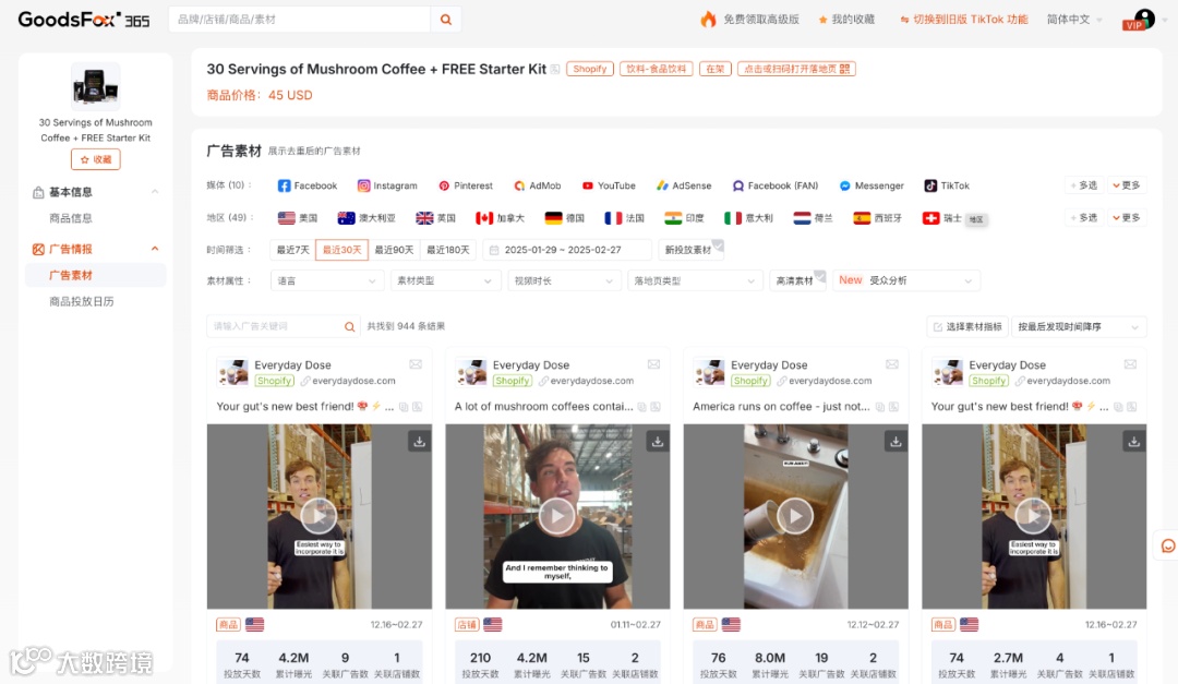 受益于北美功能性食品年均15%的增长红利,“蘑菇咖啡”赛道在美国爆发。根据 GoodsFox 数据,融合功能蘑菇与咖啡的创新饮品正在美国掀起健康消费革命。主打"30袋装蘑菇咖啡+免费新手套装"的 Everyday Dose 近期营销攻势凶猛,其全球独立站访问量达29,370名,近30天广告素材投放量激增 30,100% 至 900 多条,单价45美元的产品通过添加胶原蛋白、益智成分的组合配方,精准切中都市人群对提神减压的复合需求。