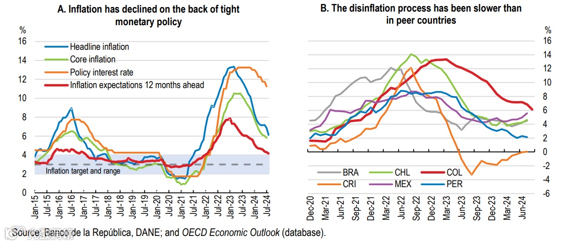 哥伦比亚在2024年采取了紧缩的货币政策,利率从2月份的7.6%的高峰,到7月份降至6.7%。这一政策使得通胀率从2023年3月的13.3%的高点,下降到2024年8月的6.1%。尽管汽油价格上涨,但由于政府逐步取消不合理的补贴,以及2023年和2024年最低工资分别上涨16%和12%,因此通胀才能得到有效控制。