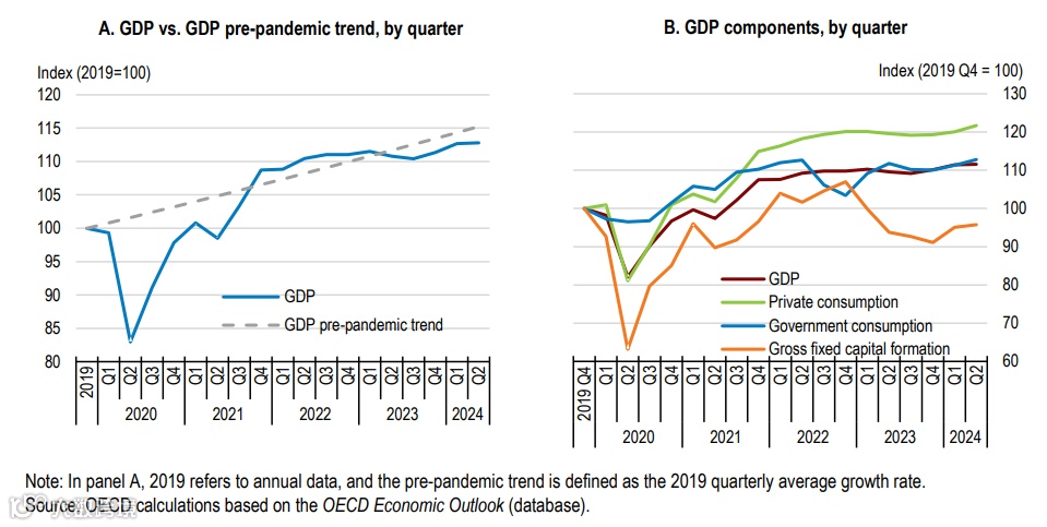 不过,2024年经济开始好转。上半年,GDP比上一季度增长了1.7%,主要是因为私人消费又开始增加了。投资也开始回升,尤其是基础设施方面。但2024年第二季度的增长只有0.1%,说明经济还在慢慢恢复中。