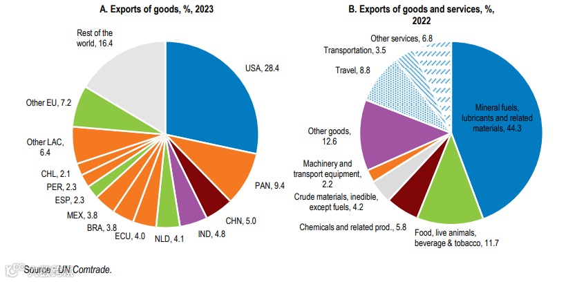 然而,哥伦比亚在国际贸易中仍有进步的空间。哥伦比亚的出口主要集中在少数自然资源,比如石油和矿产,这些占了出口的近一半(44%),初级产品(如石油、煤炭和农产品)占了60%。美国是主要的出口目的地,其他拉美国家也是重要市场。因此,多元化出口对于哥伦比亚是至关重要。这不仅有助于经济增长,也是哥伦比亚实现绿色转型、摆脱对化石燃料依赖的关键。绿色转型需要开发新的出口增长点,推动生产转型,发展更广泛的工业和出口结构。