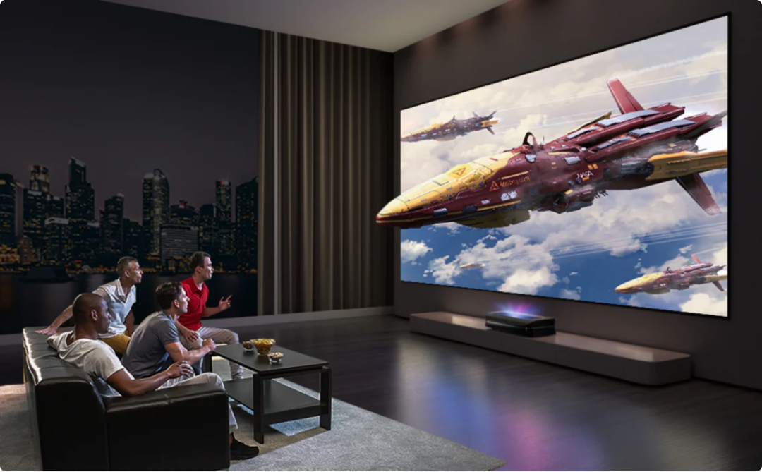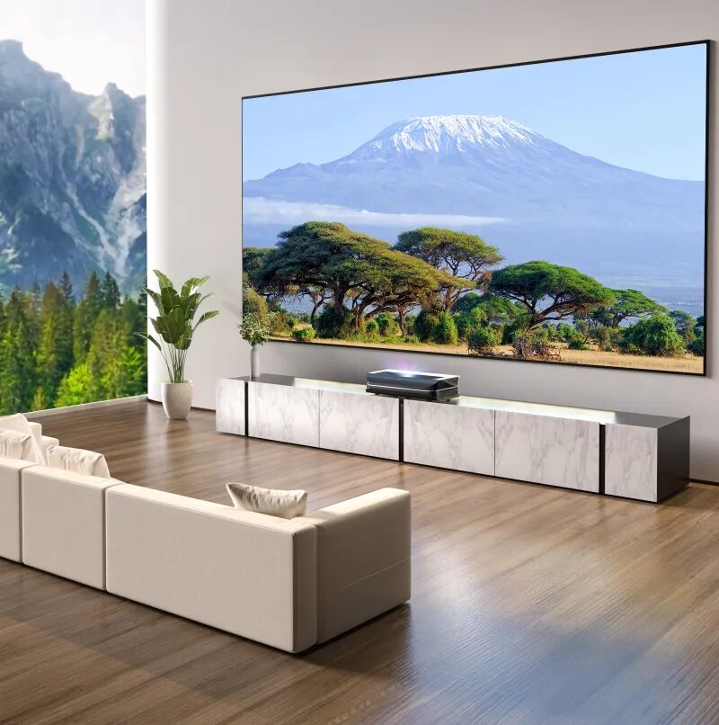 将超短焦投影机、可升降/可隐藏的电动屏幕与智能收纳柜/音响整合,主打“家居一体化的大屏体验”,减少传统电视的空间视觉占用。产品在官网、零售平台和展会展示为整套解决方案。
