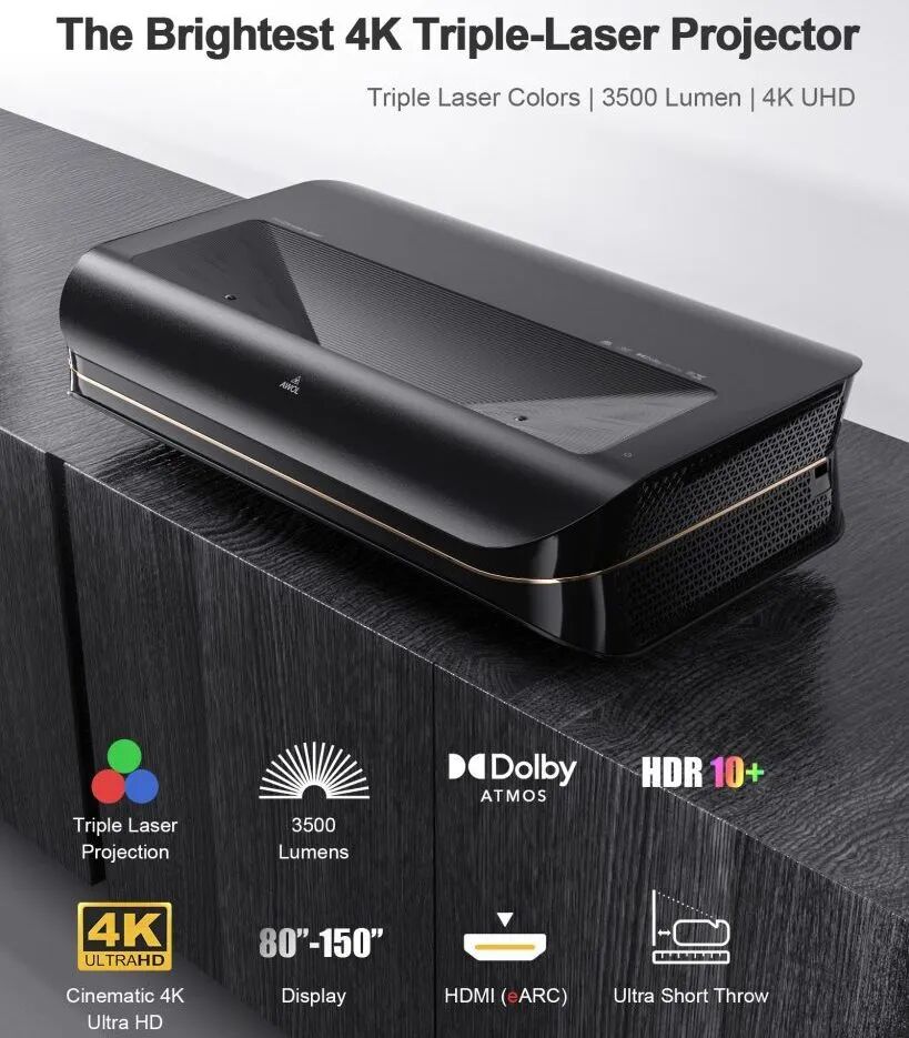 强调高亮度(数千 ANSI 流明)、三色激光(无需色轮)和对Dolby Vision / Atmos、HDR10+ 等标准的支持,适配100–150寸甚至更大画面。