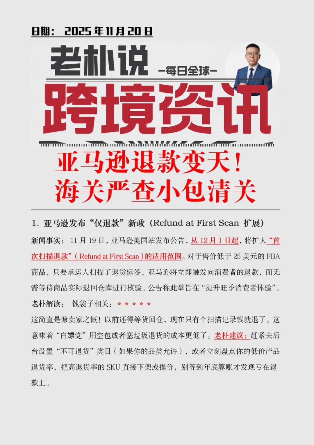 先说那个让老朴血压飙升的消息:亚马逊美国站扩大“首次扫描退款”(Refund at First Scan)。