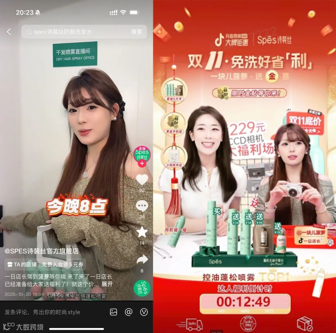这次双11,护发品牌Spes就在直播间将这一策略贯彻到底。品牌在双11期间与美妆日化垂类10万粉以下达人@一块儿菠萝合作开展“一日店长” 活动。