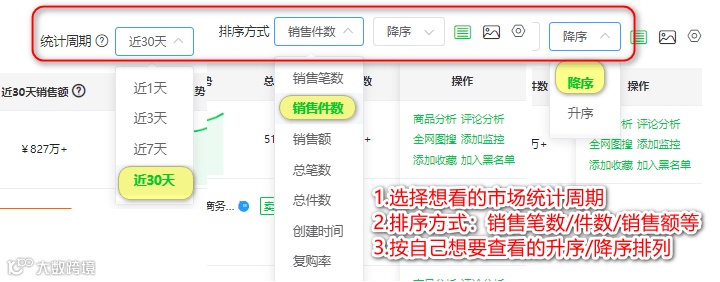 所以我们选择近30天,筛选维度可以按销售笔数/销售件数/销售额进行排序,这个可以按照自己更看重的指标去做筛选,从而选择TOP3-5的店铺或者店铺中热销单品去对标拆解,了解竞争对手产品线、价格策略、销售情况。