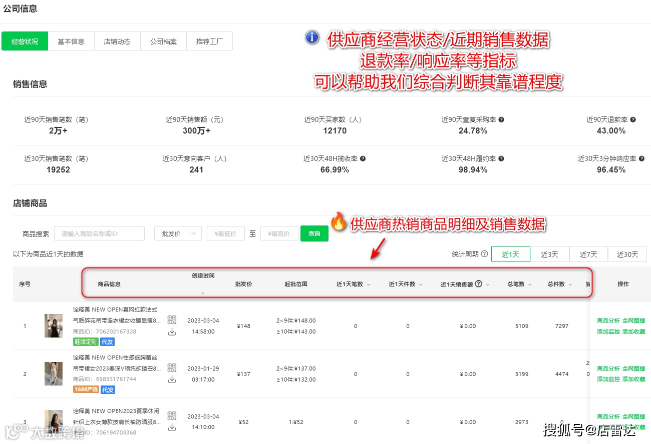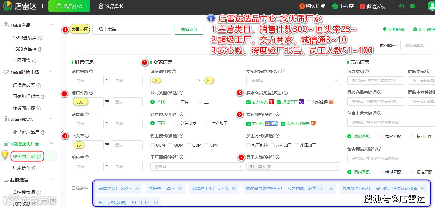 店雷达-找优质厂家。优先筛选超级工厂再筛掉一些基础条件选出我认为更优质的供应商,进一步根据厂家的经营状况、历史销量、工厂规模、采购商评价等结合自身经营需求全面分析,这样选出的供应链才是可持续合作的。