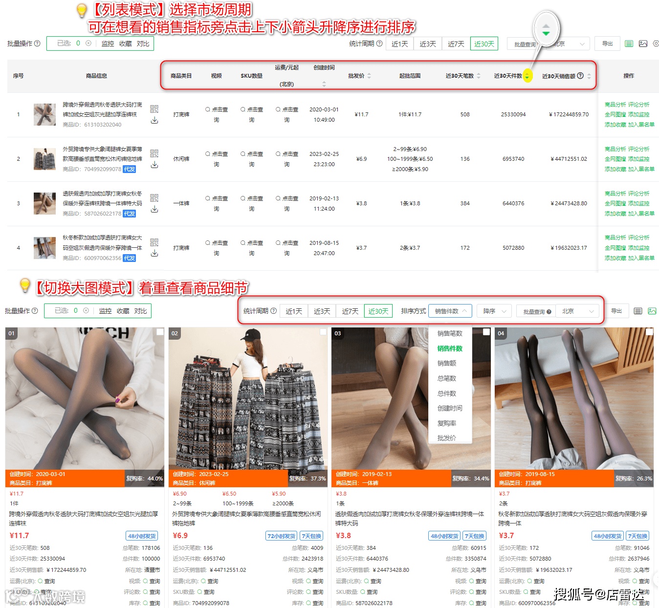 筛选出符合目标的商品信息后,市场统计周期选择近7天的数据,看近1周热卖的情况。基本我们想要的信息都一目了然,以前还要通过各个渠道自己去比对这些商品数据去做分析